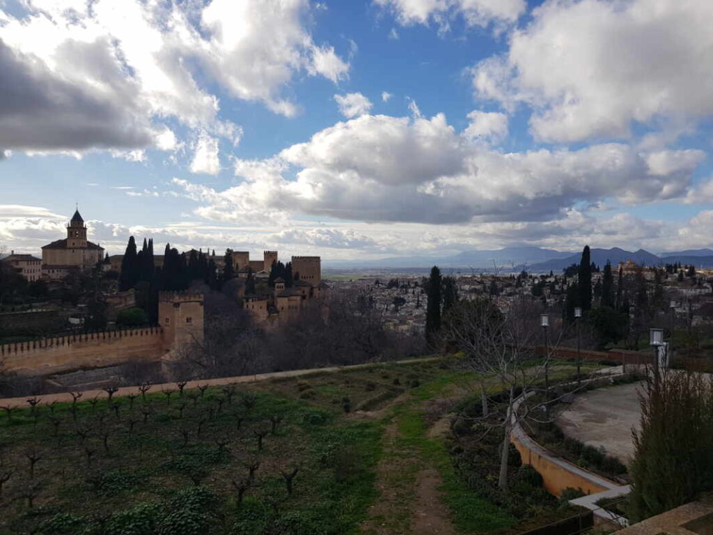 Sonntag, 8. Februar: Heute kam endlich mal die Sonne raus. Gemeinsam mit zwei anderen Teilnehmenden fuhr ich ins Stadtzentrum zur legendären Alhambra. Gestern hatten wir die ja nur von unten gesehen, heute sollte es also hinauf gehen. Wir kamen zwar recht spät an, ergatterten aber tatsächlich noch drei der tageslimitierten Tickets für den Jardín de Generalife und die Alcazaba, zwei der Teilbereich innerhalb der Festungsanlage der Alhambra. Der Garten ist wunderschön angelegt, kein Wunder, gilt der Garten im Islam doch als das Paradies, und hatte viele Wasserspiele zu bieten, was ebenfalls nicht verwunderlich ist, da Wasser im Islam als Symbol der Reinheit angesehen wird. Vom Hauptturm der Zitadelle Alcazaba hat man einen atemberaubenden Blick in alle Himmelsrichtungen, der offenbarte, dass Granada in alle Richtungen von Bergen umgeben ist, was im Übrigen einer der Gründe für die Standortwahl Granadas und auch der Alhambra war. Mein persönliches Highlight war jedoch ein anderes Bauwerk innerhalb der Alhambra, der Palacio de Carlos V, ein Renaissance-Schloss mitten in der Festung mit Marmorboden, holzvertäfelten Decken und Säulen aus Konglomeratgestein.