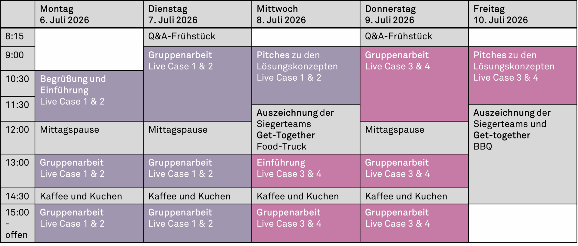 - Live Case Study Montag bis Mittwoch oder Live Case Study Mittwoch bis Freitag, inklusive gemeinsame Essen und Get-together